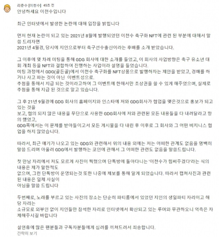 2021년 9월 GDG 인스타그램과 홈페이지에 이천수와 협업을 맺은 것처럼 홍보한 건에 관하여